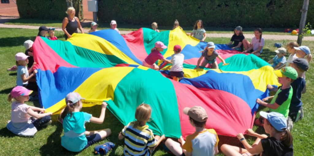 - Team- und Fangenspiele Beachvolleyball, Fußball, Unihoc, Handball Airtrack, Riesenfallschirm